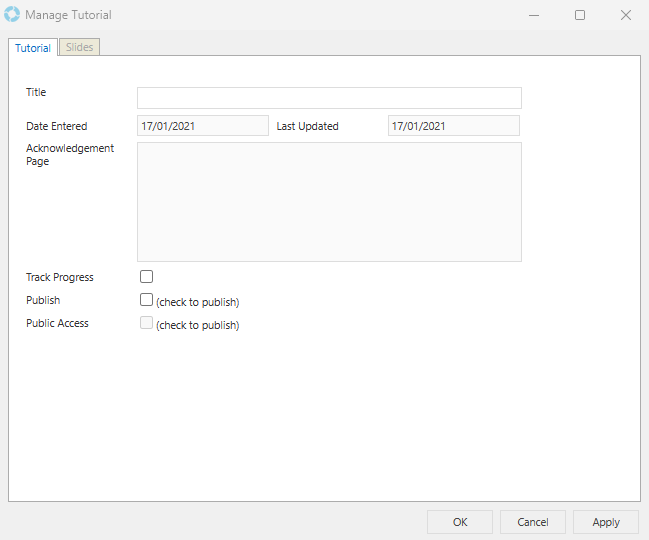 | Track Progress | Ticking this box enables the Acknowledgement Page field and allows for the Users progress to be tracked as they go through the Tutorial. This allows a User to return to where they left off, if required. |